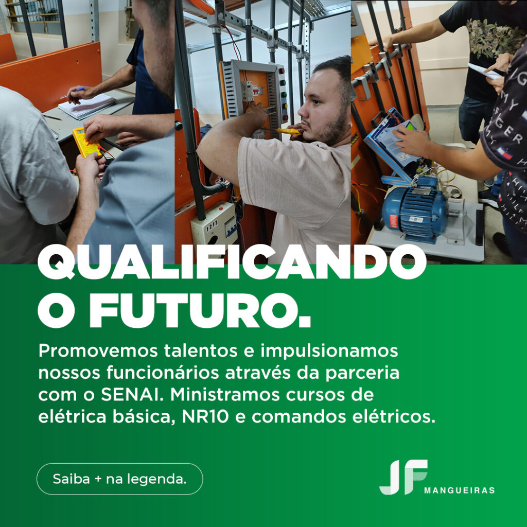 Por isso, em parceria com o SENAI, investimos na formação dos funcionários da JF Mangueiras, preparando-os para uma carreira sólida e promissora, com os cursos de elétrica básica, nr10 e comandos elétricos.